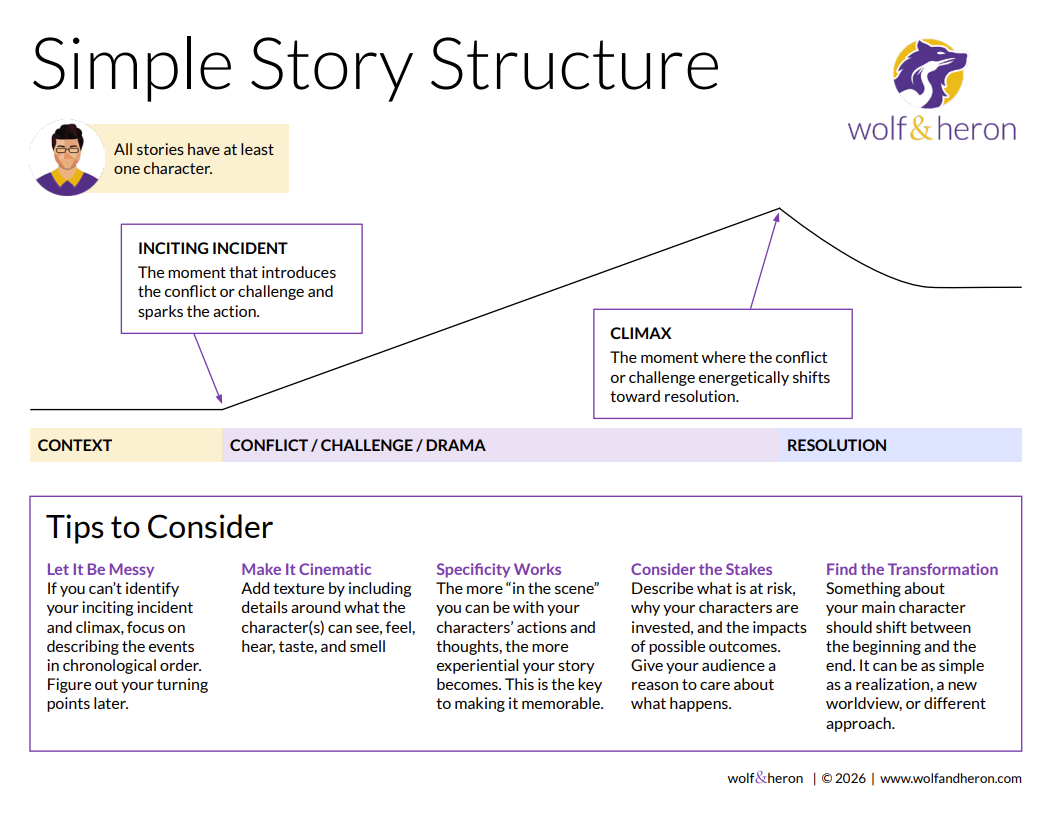 A one-page reference basic story structure with some tips for how to work through mapping your story idea to the structure.
