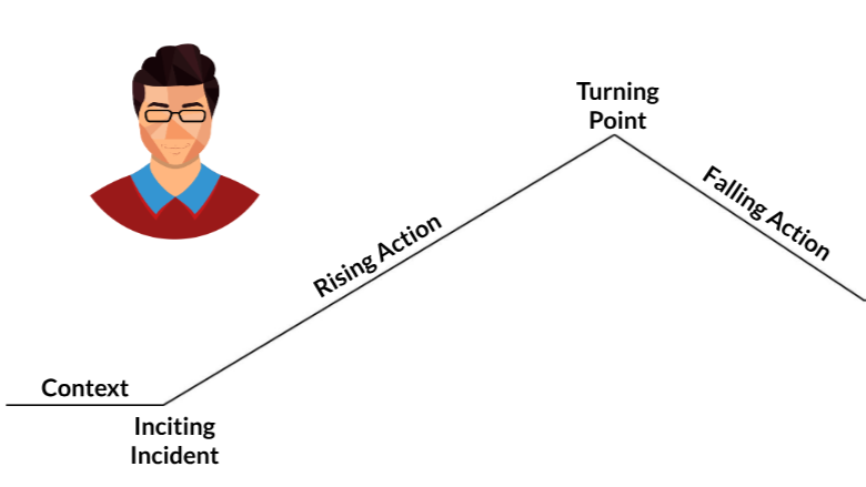 When we work with our clients to help them craft stories to incorporate into their presentations, we often start by discussing exactly what a story is. A story has at least one character that goes on a literal or metaphorical journey. This journey can be described with the six basic building blocks of story structure outlined below. The most important elements of the story—the Inciting Incident and the Turning Point—are very specific moments in time where the character experiences, learns, or notices something. When crafting a story, ensuring clarity and specificity with respect to these two moments helps the story become experiential rather than simply being an overview, description, or summary.