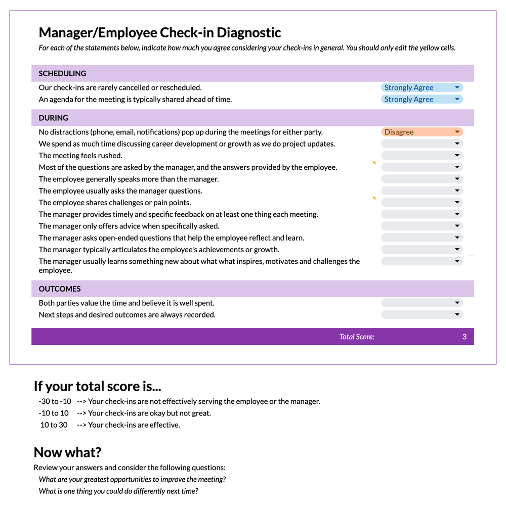 Since check-ins are so important, we wanted to make sure managers are empowered with a diagnostic tool to evaluate the quality of the one-on-one conversations they’re having with the employees. Managers can complete the diagnostic to evaluate how well they’re doing in leading these critical meetings.