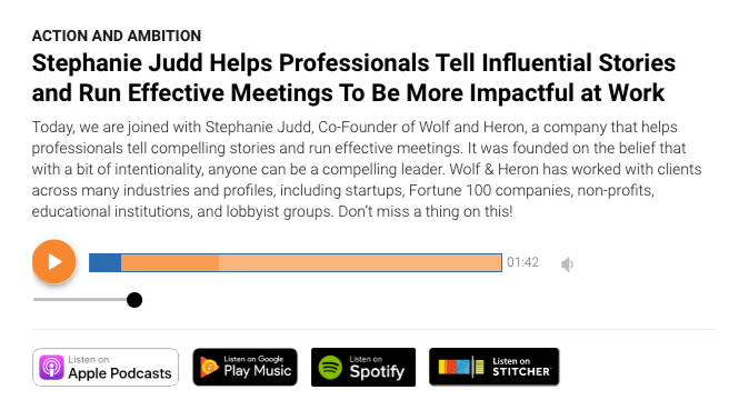 Stephanie sat down with Philip Lanos of Entrepreneur’s Action & Ambition podcast to discuss the genesis of Wolf & Heron, the entrepreneur journey, and the power of intentional storytelling and meeting design.